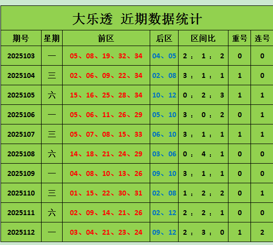 大乐透上期开出奖号:03 04 21 23 24+09 12,区间比是2 : 3 : 0,开出连号03 04, 23 24,开出重号21。