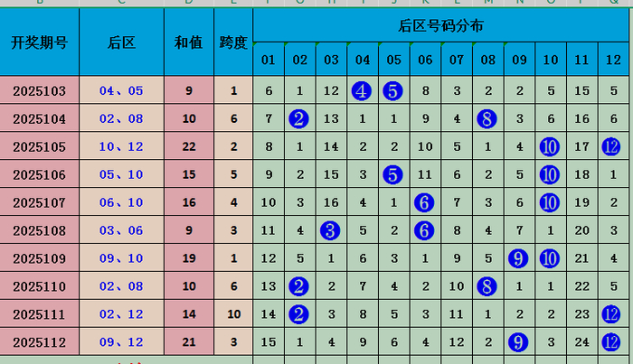 上期后区开出号码09 12,和值21,近十期和值9 10 22 15 16 9 19 10 14 21,和值波动范围较大,本期预测和值会下降,重点关注号码:04 06,和值10 。