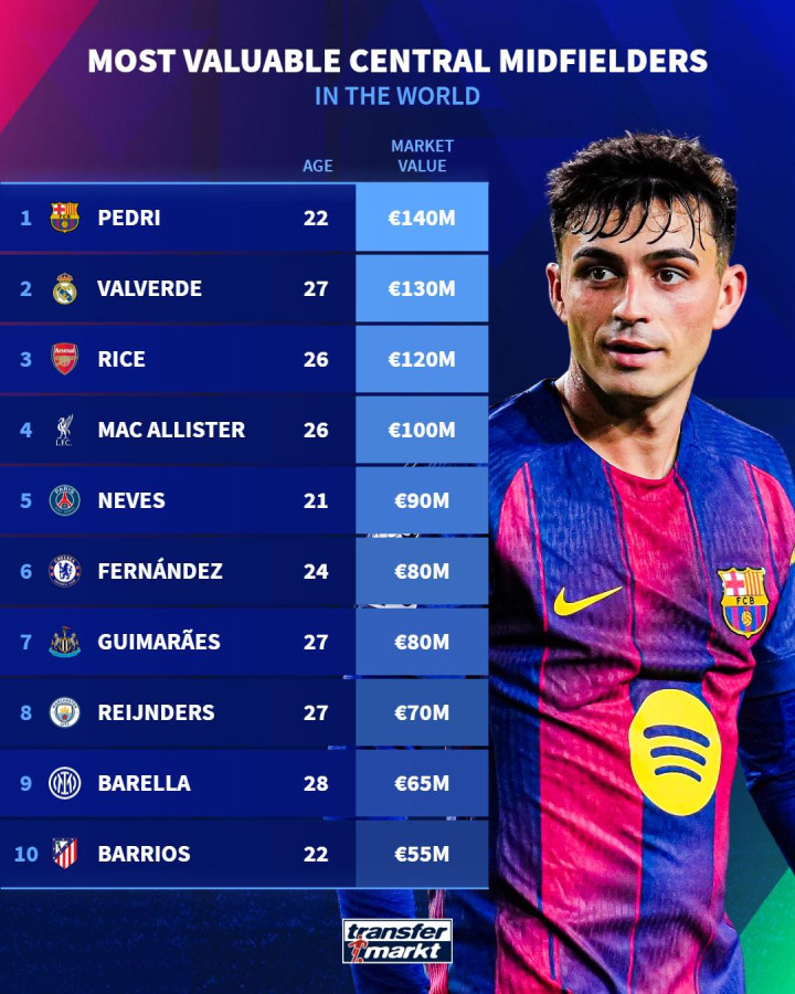 中前卫身价排行: 佩德里1.4亿欧居首, 巴尔韦德、赖斯前三