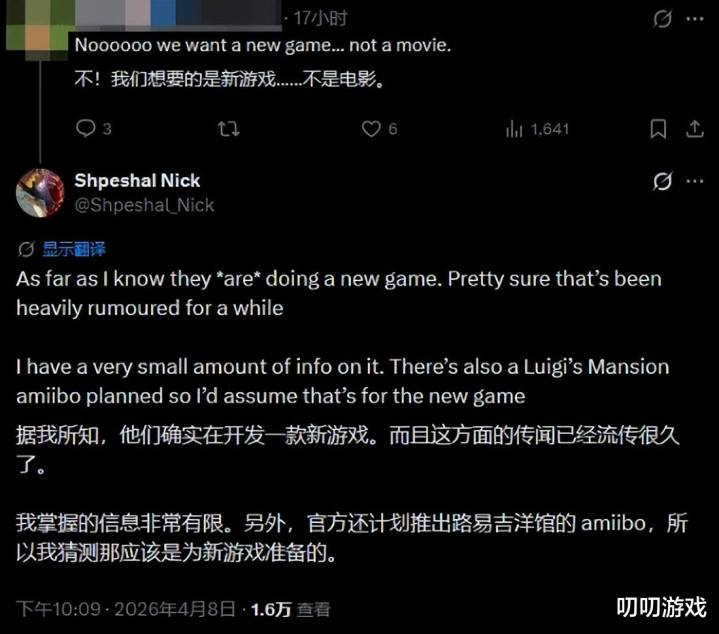 Shpeshal Nick回复说,据他所知,任天堂确实正在开发一款《路易吉鬼屋》的新游戏,但自己也所知不多,建议大家理性看待。