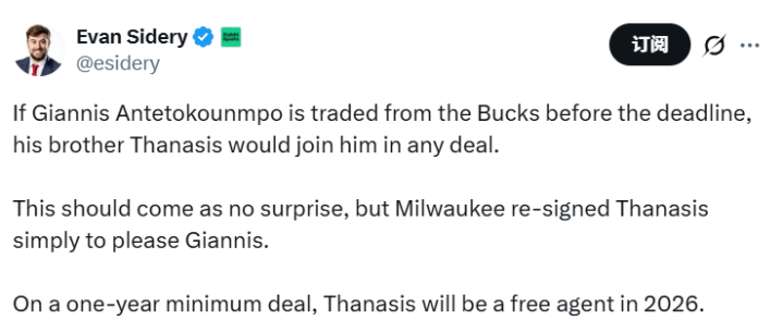 还有一些需要考虑的因素:有意引进字母哥的球队,必须确认他愿意在休赛期与球队续约。自10月2日起,字母哥就有资格签下一份为期四年、价值2.75亿美元的续约合同。另外,无论字母哥被交易到哪支球队,他的哥哥萨纳西斯预计都会一起被打包。之前雄鹿用底薪签下萨纳西斯,也只是为了取悦字母哥。