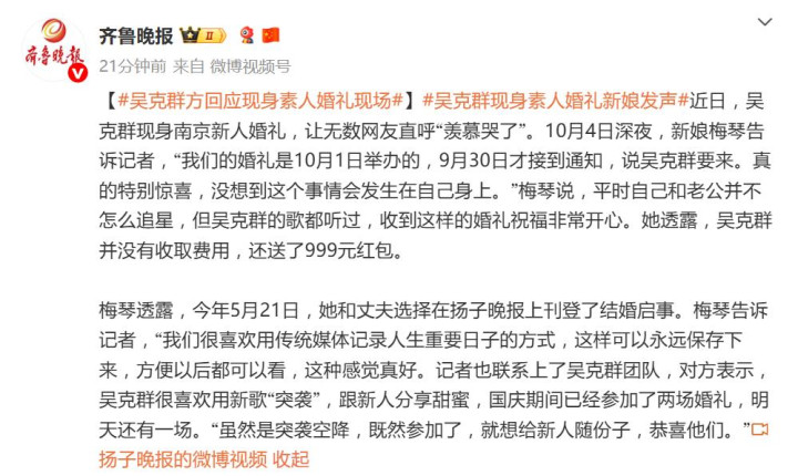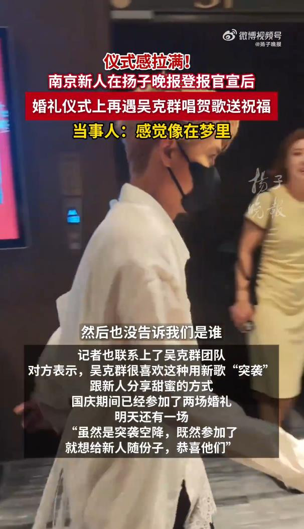 这场“突袭”背后,其实早有伏笔。原来今年5月21日,梅琴夫妇选择在《扬子晚报》刊登结婚启事,用传统媒体记录人生重要时刻的方式,意外吸引了吴克群团队的注意。新娘坦言:“我们很喜欢这种能永久保存的形式,没想到会因此收获惊喜。”